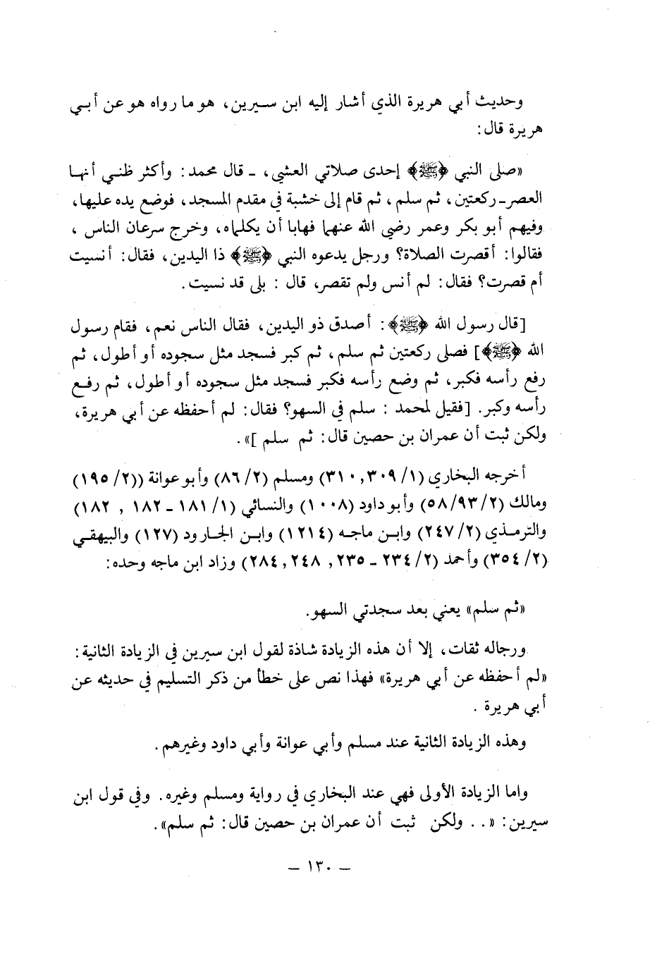 وحديث أبى هريرة الذى أشار إليه ابن سيرين , هو ما رواه هو عن أبى هريرة قال: " صلى النبى صلى الله عليه وسلم إحدى صلاتى العشى , ـ قال محمد: وأكثر ظنى أنها العصر ـ ركعتين , ثم سلم , ثم قام إلى خشبة فى مقدم المسجد , فوضع يده عليها , وفيهم أبو بكر وعمر رضى الله عنهما فهابا أن يكلماه , وخرج سرعان الناس , فقالوا: أقصرت الصلاة؟ ورجل يدعوه النبى صلى الله عليه وسلم ذا اليدين , فقال: أنسيت أم قصرت؟ فقال: لم أنس ولم تقصر , قال: بلى قد نسيت. [قال رسول الله صلى الله عليه وسلم: أصدق ذو اليدين , فقال الناس نعم , فقام رسول الله صلى الله عليه وسلم] فصلى ركعتين ثم سلم , ثم كبر فسجد مثل سجوده أو أطول , ثم رفع رأسه فكبر , ثم وضع رأسه فكبر فسجد مثل سجوده أو أطول , ثم رفع رأسه وكبر. [فقيل لمحمد: سلم فى السهو؟ فقال: لم أحفظه عن أبى هريرة , ولكن ثبت أن عمران بن حصين قال: ثم سلم] ".
