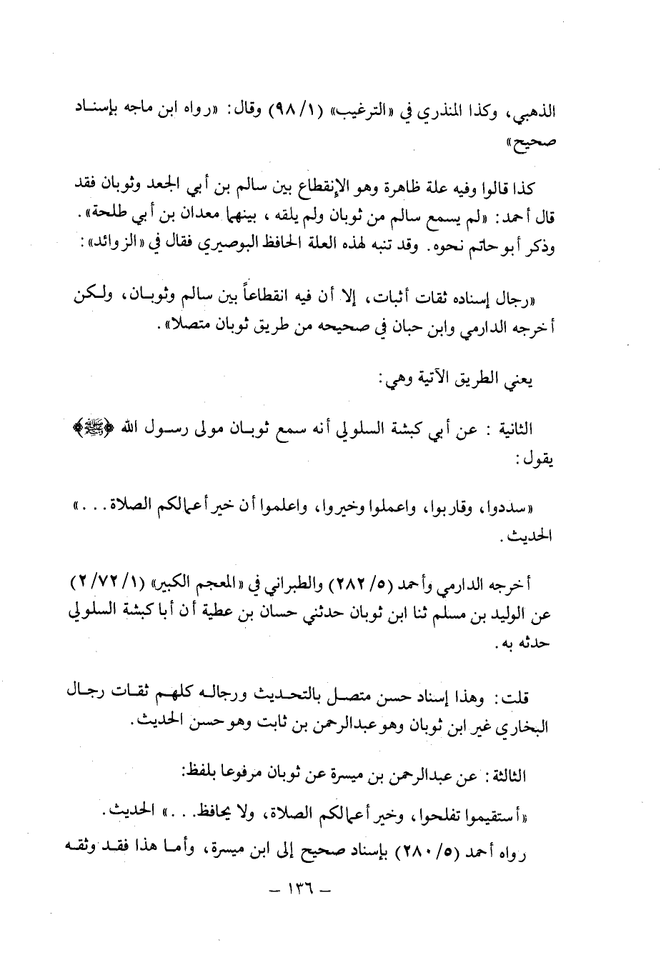 وذكر أبو حاتم نحوه. وقد تنبه لهذه العلة الحافظ البوصيرى فقال فى " الزوائد ": " ورجال إسناده ثقات أثبات , إلا أن فيه انقطاعا بين سالم وثوبان , ولكن أخرجه الدارمى وابن حبان فى صحيحه من طريق ثوبان متصلا ".