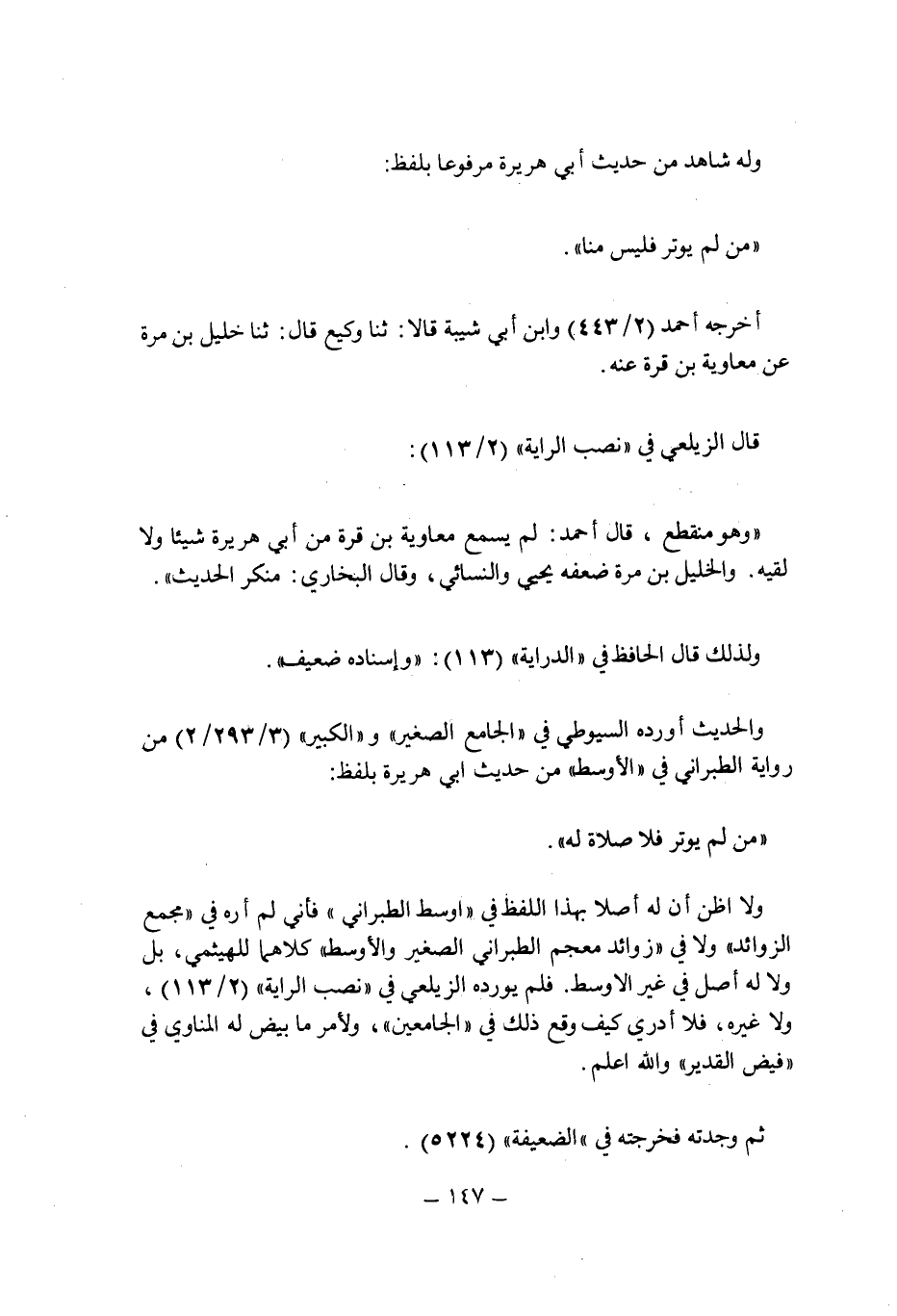 والحديث أورده السيوطى فى " الجامع الصغير " و" الكبير " (3/293/2) من رواية الطبرانى فى " الأوسط " من حديث أبى هريرة بلفظ: " من لم يوتر فلا صلاة له ".