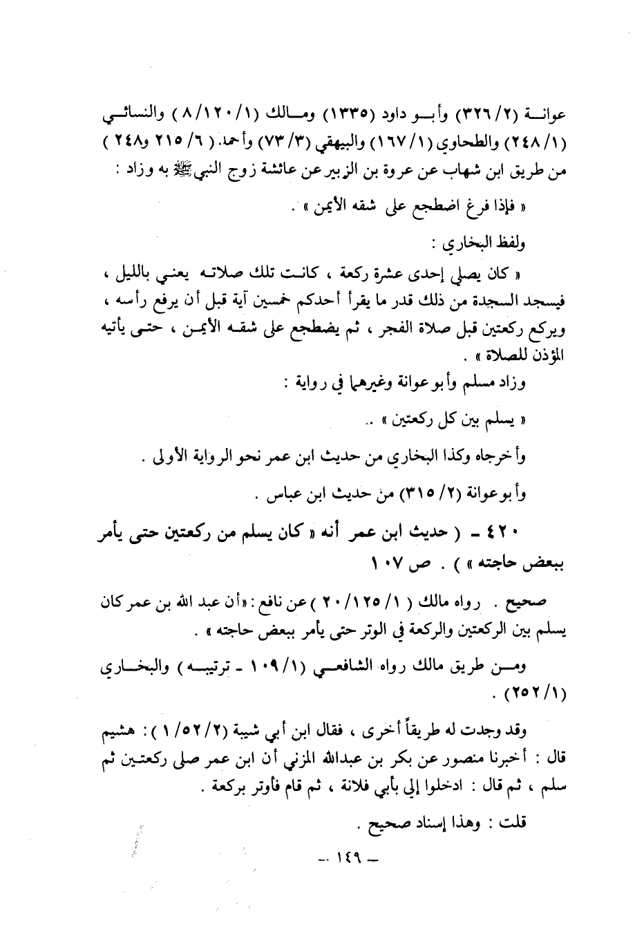 (420) - (حديث ابن عمر أنه: " كان يسلم من ركعتين حتى يأمر ببعض حاجته " (ص 107) .