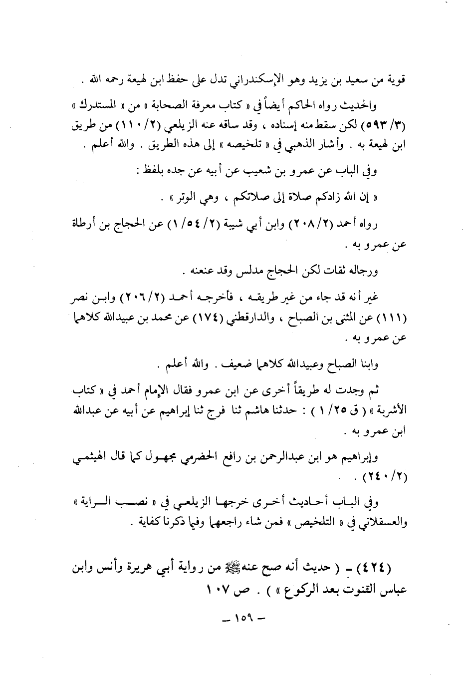 (424) - (حديث: أنه صح عنه صلى الله عليه وسلم من رواية أبى هريرة وأنس وابن عباس القنوت بعد الركوع (ص 107) .