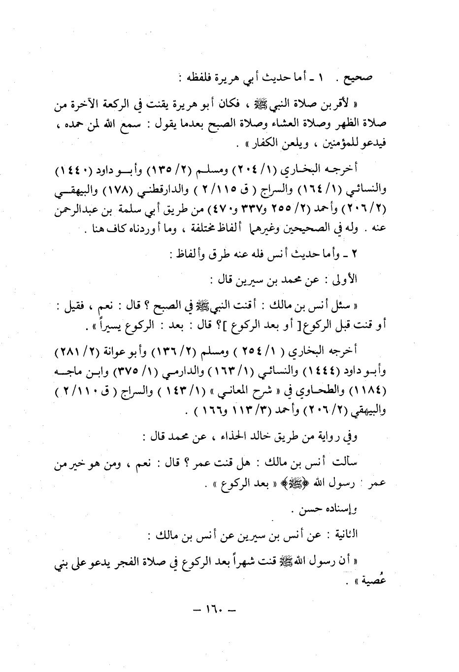 الأولى: عن محمد بن سيرين قال: " سئل أنس بن مالك: أقنت النبى صلى الله عليه وسلم فى الصبح؟ قال: نعم , فقيل: أو قنت قبل الركوع [أو بعد الركوع] ؟ قال: بعد: الركوع يسيرا ".
