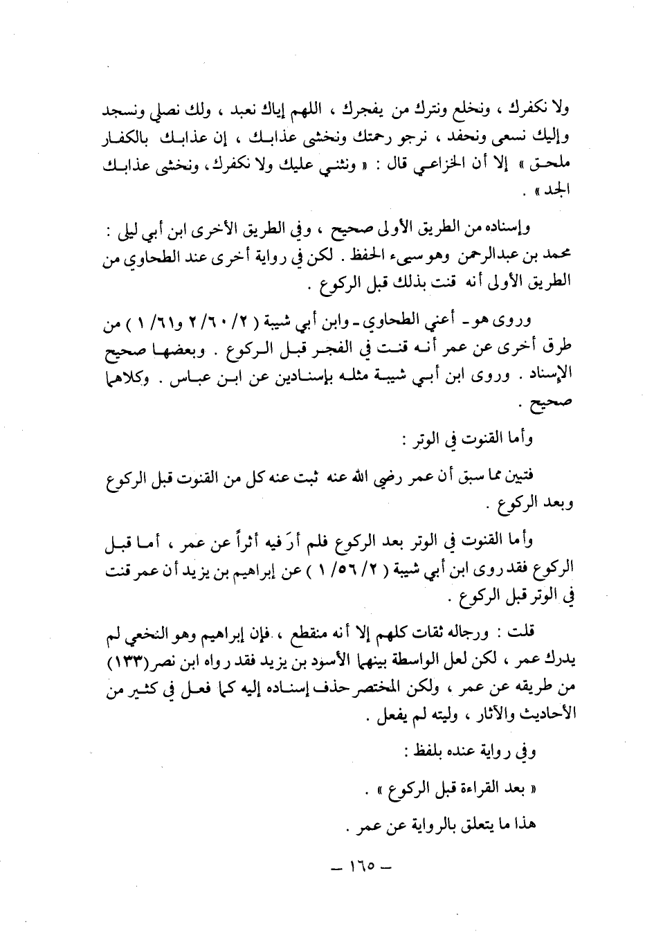 وروى هو ـ أعنى الطحاوى ـ وابن أبى شيبة (2/60/2 , 61/1) من طرق أخرى عن عمر أنه قنت فى الفجر قبل الركوع , وبعضها صحيح الإسناد.