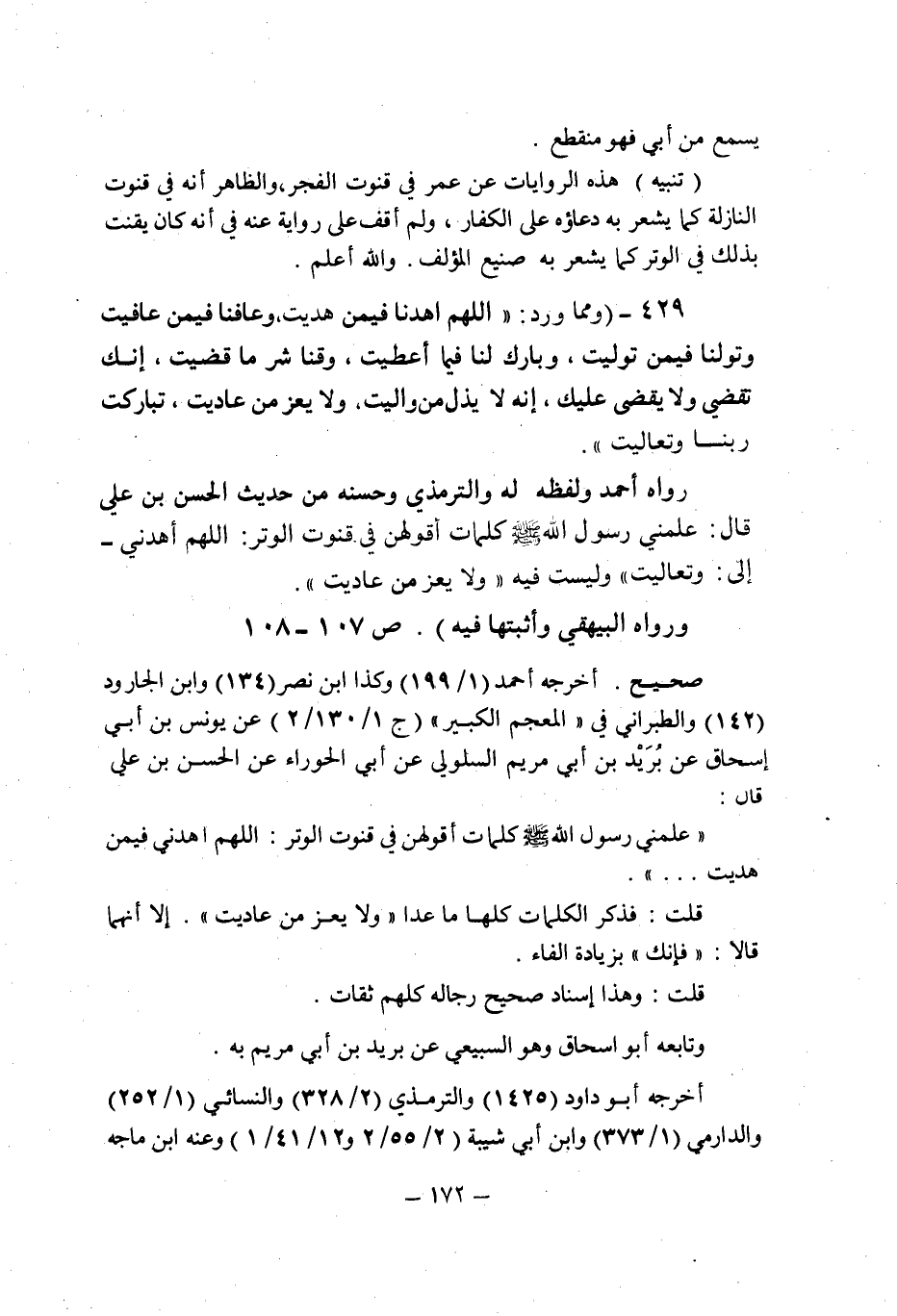 (429) - (ومما ورد: " اللهم اهدنا فيمن هديت , وعافنا فيمن عافيت وتولنا فيمن توليت , وبارك لنا فيما أعطيت , وقنا شر ما قضيت , إنك تقضى ولا يقضى عليك , إنه لا يذل من واليت , ولا يعز من عاديت , تباركت ربنا وتعاليت ". رواه أحمد - ولفظه له- والترمذى وحسنه من حديث الحسن بن على قال: علمنى رسول الله صلى الله عليه وسلم كلمات أقولهن فى قنوت الوتر: " اللهم اهدنى ـ إلى - وتعاليت - وليست فيه - ولا يعز من عاديت ". ورواه البيهقى وأثبتها فيه (ص 107 ـ 108) .