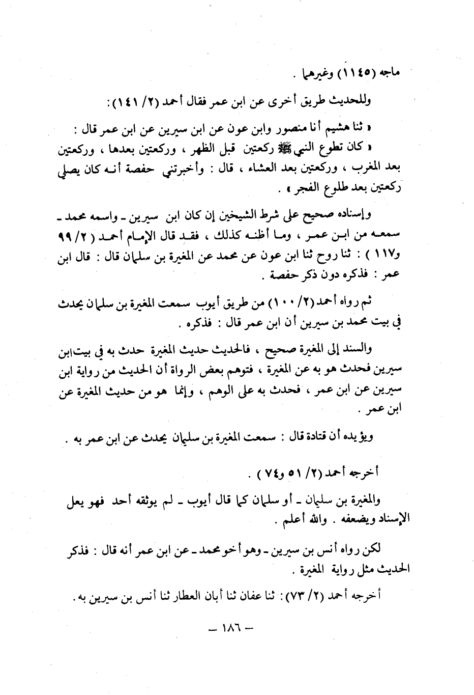 وللحديث طريق أخرى عن ابن عمر فقال أحمد (2/141) : حدثنا هشيم أنبأنا منصور وابن عون عن ابن سيرين عن ابن عمر قال: كان تطوع النبى صلى الله عليه وسلم ركعتين قبل الظهر , وركعتين بعدها , وركعتين بعد المغرب , وركعتين بعد العشاء , قال: وأخبرتنى حفصة أنه كان يصلى ركعتين بعد طلوع الفجر ".