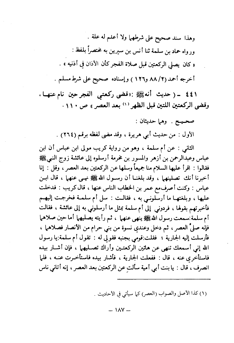 الثانى: عن أم سلمة , وهو من رواية كريب مولى ابن عباس أن ابن عباس وعبد الرحمن بن أزهر والمسور بن مخرمة أرسلوه إلى عائشة زوج النبى صلى الله عليه وسلم فقالوا: اقرأ عليها السلام منا جميعاً وسلها عن الركعتين بعد العصر , وقل: إنا أخبرنا أنك تصلينهما , وقد بلغنا أن رسول الله صلى الله عليه وسلم نهى عنهما , قال ابن عباس: وكنت أصرف مع عمر بن الخطاب الناس عنها , قال كريب: فدخلت عليها , وبلغتها ما أرسلونى به , فقالت: سل أم سلمة فخرجت إليهم فأخبرتهم بقولها , فردونى إلى أم سلمة بمثل ما أرسلونى به إلى عائشة , فقالت أم سلمة: سمعت رسول الله صلى الله عليه وسلم ينهى عنهما , ثم رأيته يصليهما أما حين صلاهما فإنه صلى العصر , ثم دخل وعندى نسوة من بنى حرام من الأنصار فصلاهما , فأرسلت إليه الجارية ; فقلت: قومى بجنبه فقولى له: تقول أم سلمة: يا رسول الله إنى أسمعك تنهى عن هاتين الركعتين وأراك تصليهما , فإن أشار بيده فاستأخرى عنه , قال: ففعلت الجارية , فأشار بيده فاستأخرت عنه , فلما انصرف , قال: يا بنت أبى أمية سألت عن الركعتين بعد العصر , إنه أتانى ناس