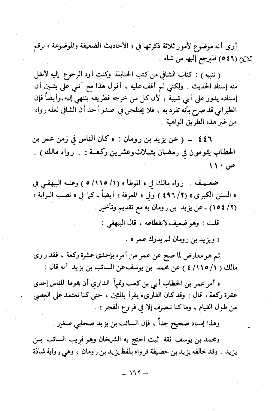 (446) - (عن يزيد بن رومان: " كان الناس فى زمن عمر بن الخطاب يقومون فى رمضان بثلاث وعشرين ركعة " رواه مالك (ص 110) .