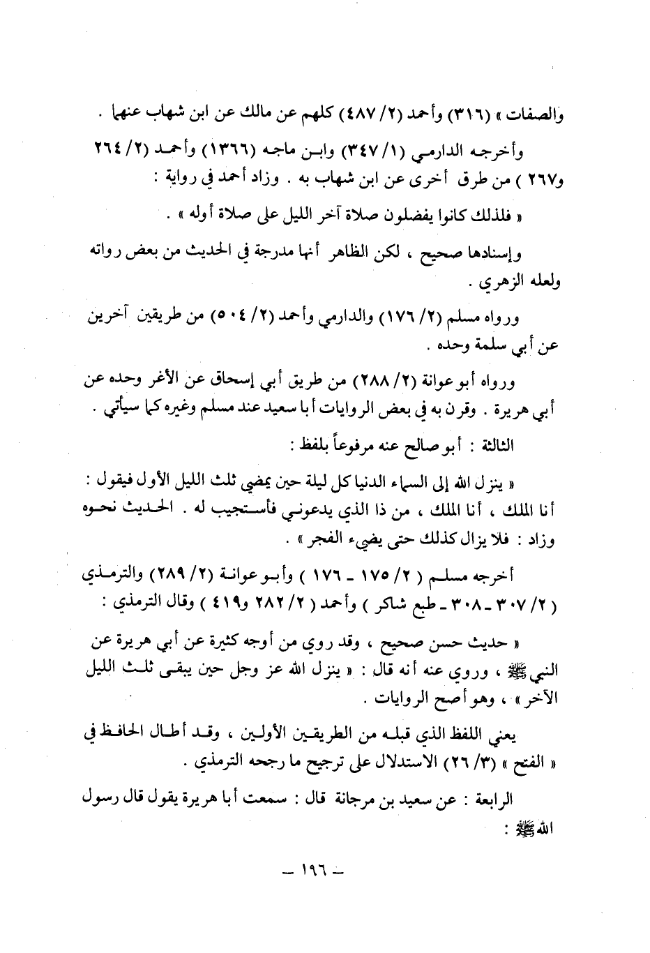 أخرجه مسلم (2/175 ـ 176) وأبو عوانة (2/289) والترمذى (2/307 ـ 308 ـ طبع شاكر) وأحمد (2/282 و419) وقال الترمذى: " حديث حسن صحيح , وقد روى من أوجه كثيرة عن أبى هريرة عن النبى صلى الله عليه وسلم , وروى عنه أنه قال: " ينزل الله عز وجل حين يبقى ثلث الليل الآخر " , وهو أصح الروايات ".