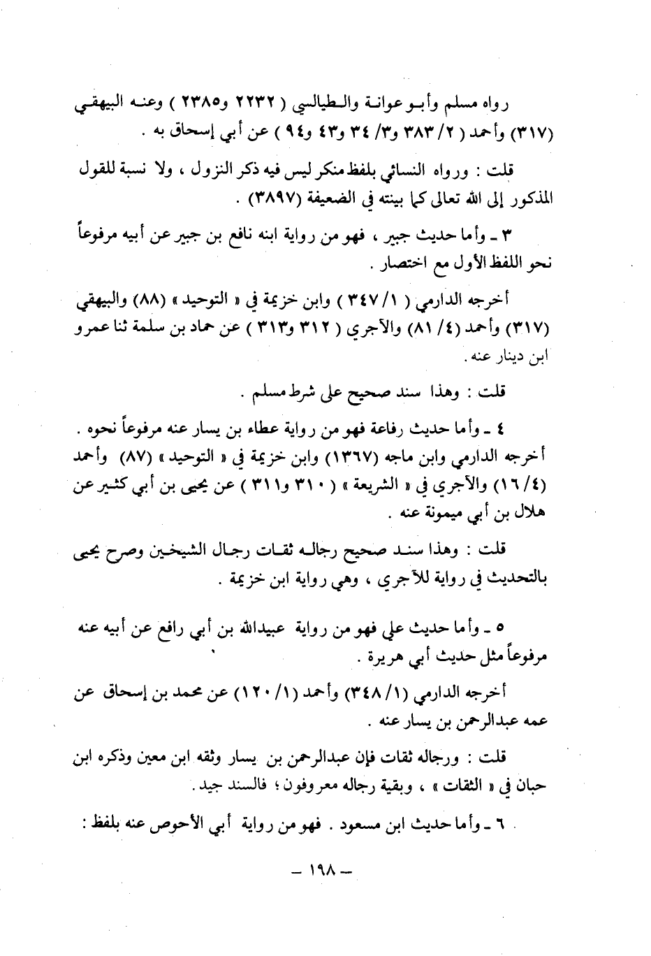قلت: ورواه النسائى بلفظ منكر ليس فيه ذكر النزول , ولا نسبة للقول المذكور إلى الله تعالى كما بينته فى الضعيفة (3897) .