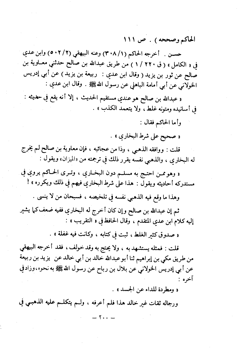 ثم إن عبد الله بن صالح وإن كان أخرج له البخارى ففيه ضعف كما يشير إليه كلام ابن عدى المتقدم , وقال الحافظ فى " التقريب ": " صدوق كثير الغلط , ثبت فى كتابه , وكانت فيه غفلة ".
