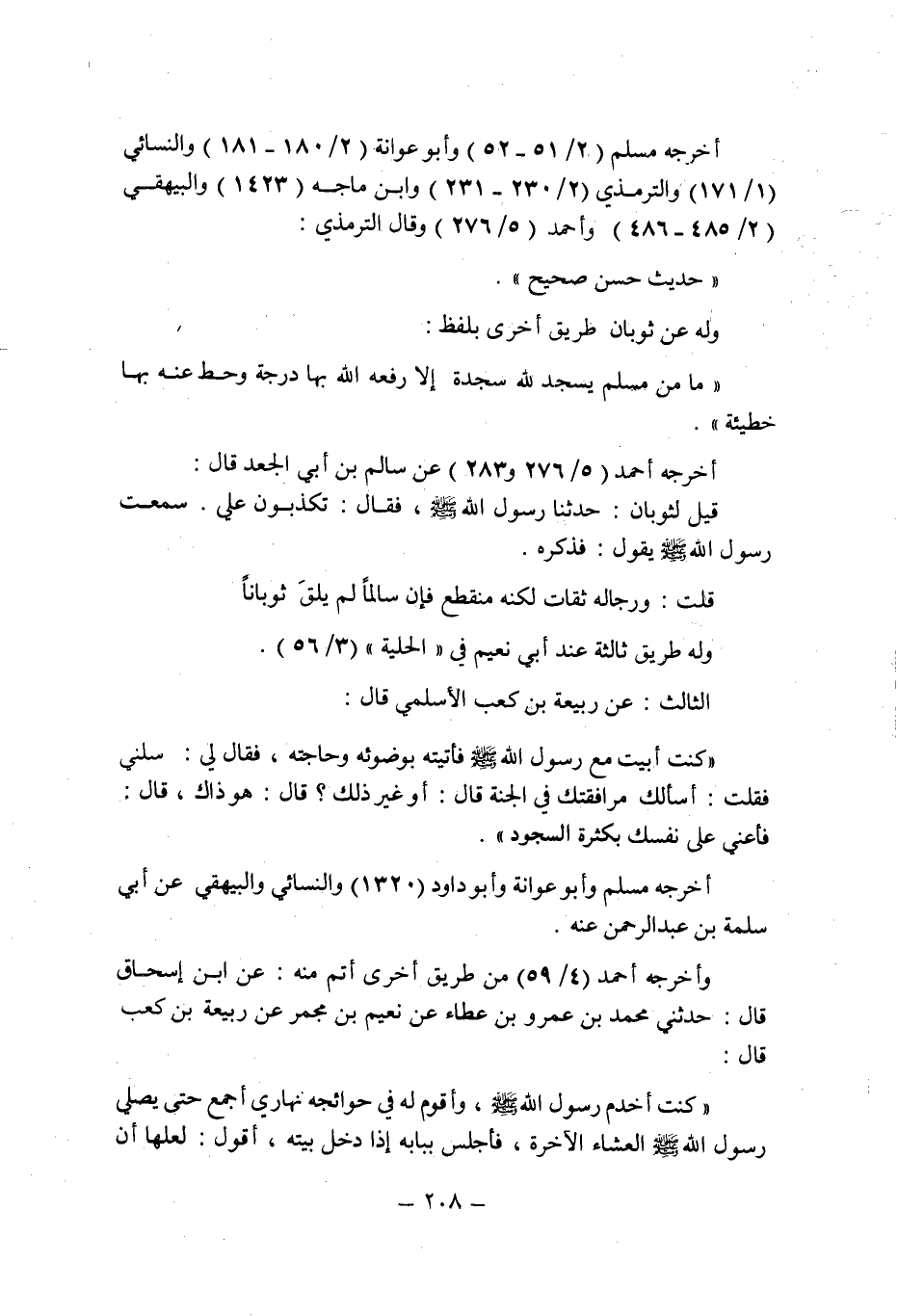 وله عن ثوبان طريق أخرى بلفظ: " ما من مسلم يسجد لله سجدة إلا رفعه الله بها درجة وحط عنه بها خطيئة ". أخرجه أحمد (5/276 و283) عن سالم بن أبى الجعد قال: قيل لثوبان: حدثنا {عن} رسول الله صلى الله عليه وسلم , فقال: تكذبون [1] على , سمعت رسول الله صلى الله عليه وسلم يقول: فذكره.