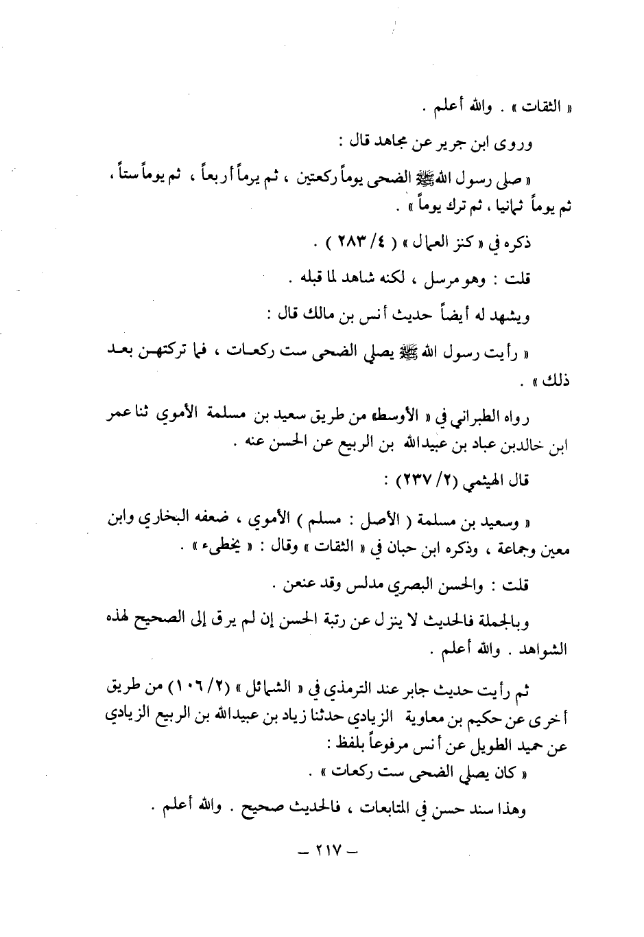ويشهد له أيضاً حديث أنس بن مالك قال: " رأيت رسول الله صلى الله عليه وسلم يصلى الضحى ست ركعات , فما تركتهن بعد ذلك". رواه الطبرانى فى " الأوسط " من طريق سعيد بن مسلمة الأموى حدثنا عمر بن خالد بن عباد بن عبيد الله بن الربيع عن الحسن عنه.