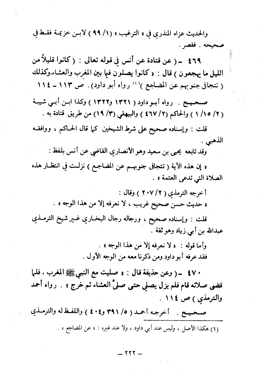 (469) - (عن قتادة عن أنس فى قوله تعالى: " كانوا قليلا من الليل ما يهجعون ". قال: " كانوا يصلون فيما بين المغرب والعشاء ". وكذلك: " تتجافى جنوبهم عن المضاجع " (1) . رواه أبو داود (ص 113 ـ 114) .