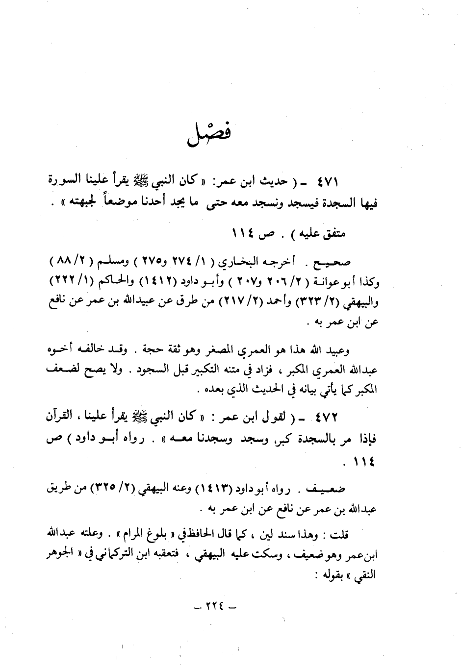 (471) - (حديث ابن عمر: " كان النبى صلى الله عليه وسلم يقرأ علينا السورة فيها السجدة فيسجد ونسجد معه حتى ما يجد أحدنا موضعاً لجبهته " متفق عليه (ص 114) .