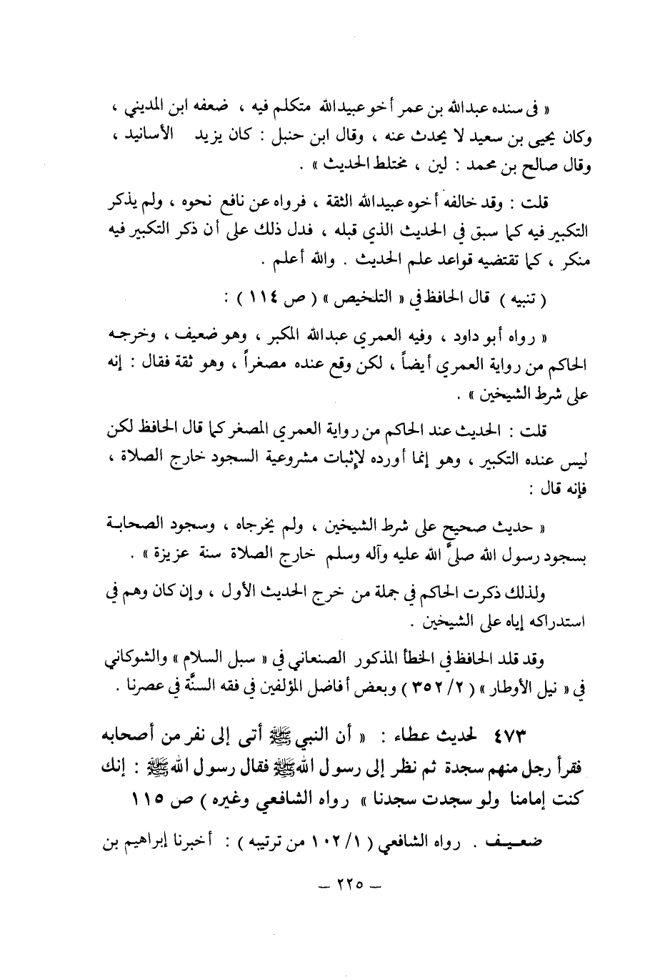 وقد قلد الحافظ فى الخطأ المذكور الصنعانى فى " سبل السلام " والشوكانى فى " نيل الأوطار " (2/352) وبعض أفاضل المؤلفين فى فقه السنة فى عصرنا.