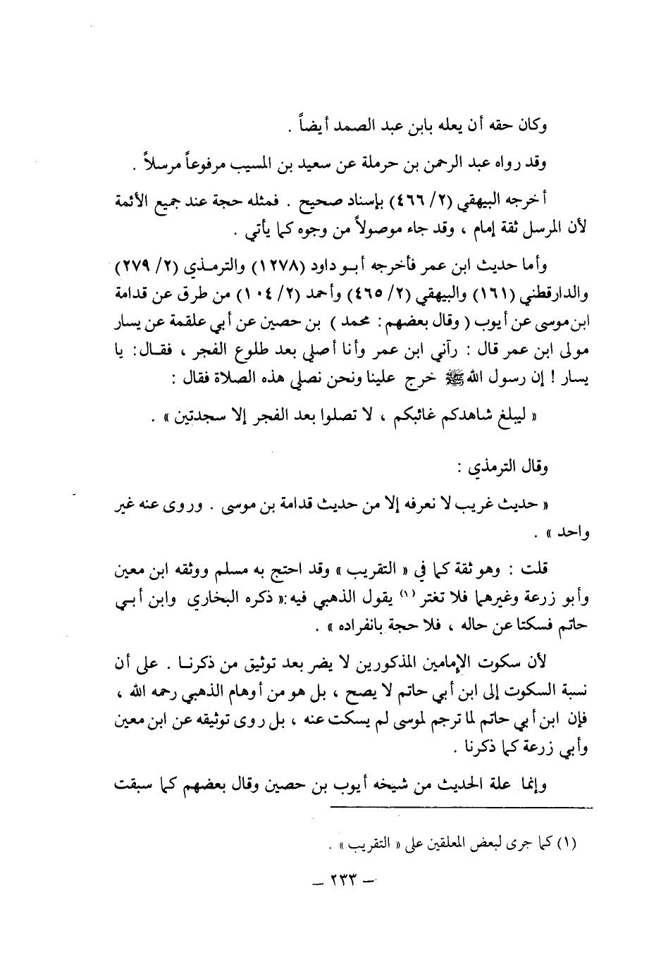 قلت: وهو ثقة كما فى " التقريب " وقد احتج به مسلم ووثقه ابن معين وأبو زرعة وغيرهما فلا تغتر (1) بقول الذهبى فيه: " ذكره البخارى وابن أبى حاتم فسكتا عن حاله , فلا حجة بانفراده ". لأن سكوت الإمامين المذكورين لا يضر بعد توثيق من ذكرنا. على أن نسبة السكوت إلى ابن أبى حاتم لا يصح , بل هو من أوهام الذهبى رحمه الله , فإن ابن أبى حاتم لما ترجم لموسى لم يسكت عنه , بل روى توثيقه عن ابن معين وأبى زرعة كما ذكرنا وإنما علة الحديث من شيخه أيوب بن حصين وقال بعضهم - كما سبقت