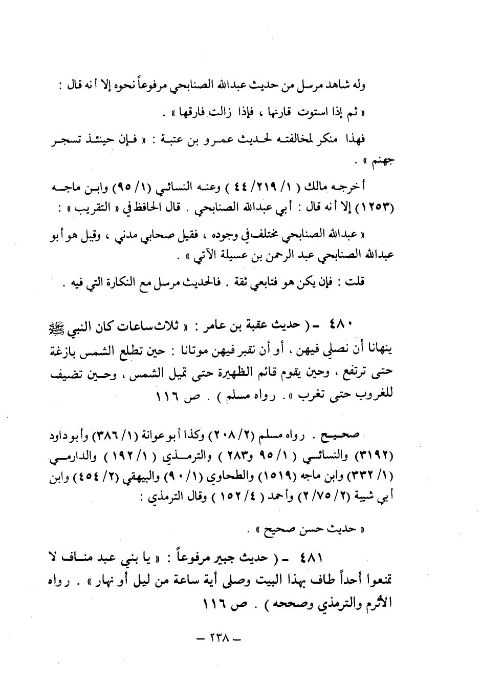 (480) - (حديث عقبة بن عامر: " ثلاث ساعات كان النبى صلى الله عليه وسلم ينهانا أن نصلى فيهن , أو أن نقبر فيهن موتانا: حين تطلع الشمس بازغة حتى ترتفع , وحين يقوم قائم الظهيرة حتى تميل الشمس , وحين تضيف للغروب حتى تغرب " رواه مسلم (ص 116) .