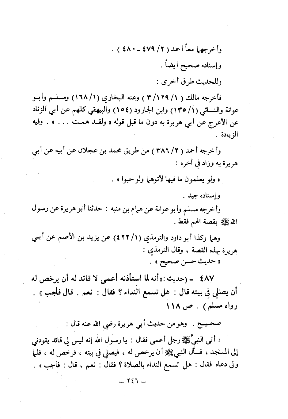 (487) - (حديث: " أنه لما استأذنه أعمى لا قائد له أن يرخص له أن يصلى فى بيته قال: هل تسمع النداء؟ فقال: نعم , قال: فأجب " رواه مسلم (ص 118) .