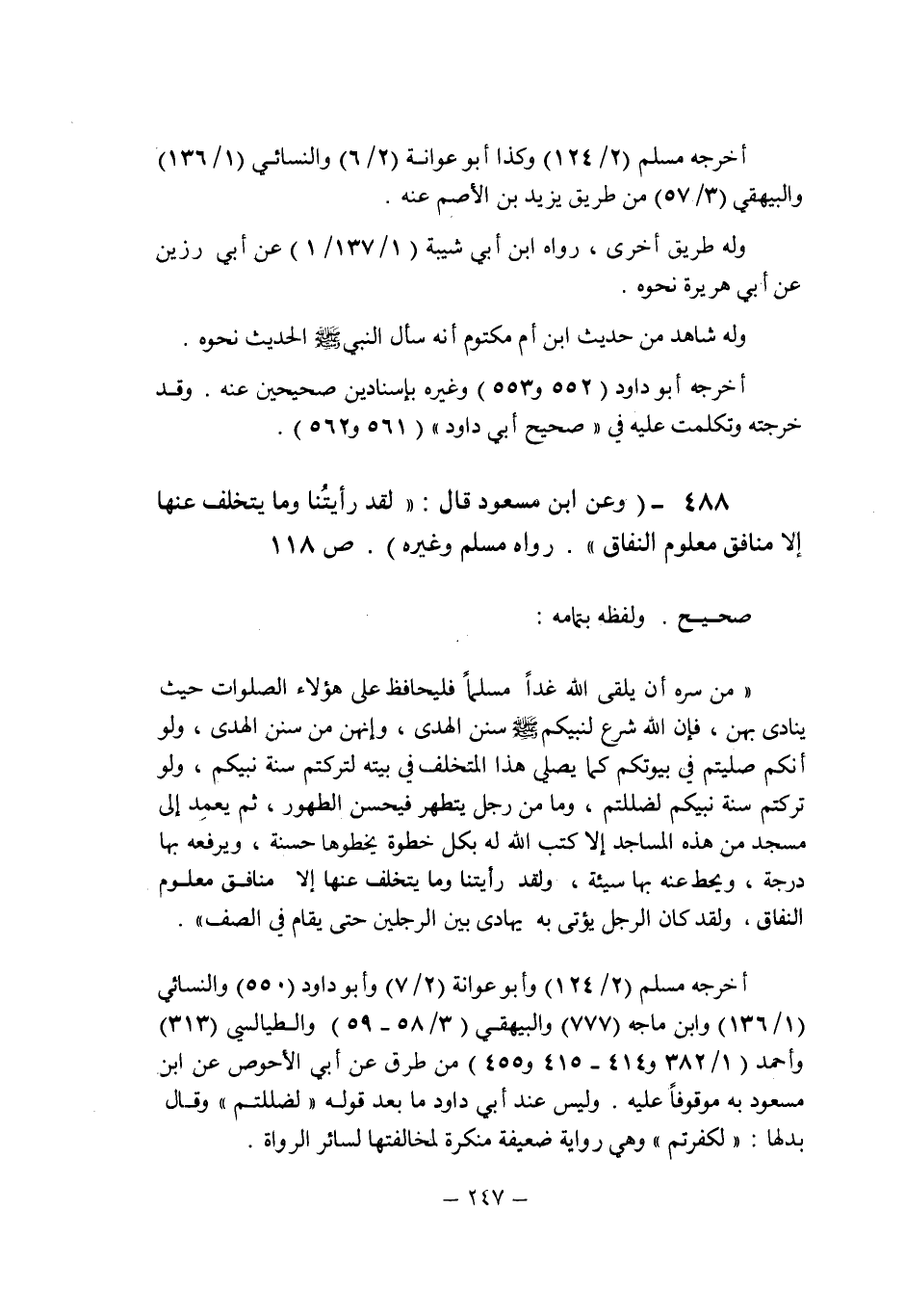 (488) - (وعن ابن مسعود قال: " لقد رأيتُنا وما يتخلف عنها إلا منافق معلوم النفاق " رواه مسلم وغيره (ص 118) .