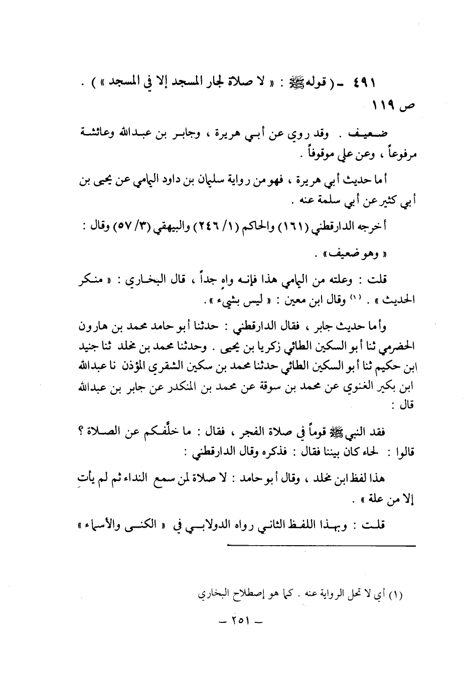 (491) - (قوله صلى الله عليه وسلم: " لا صلاة لجار المسجد إلا فى المسجد " (ص 119) .