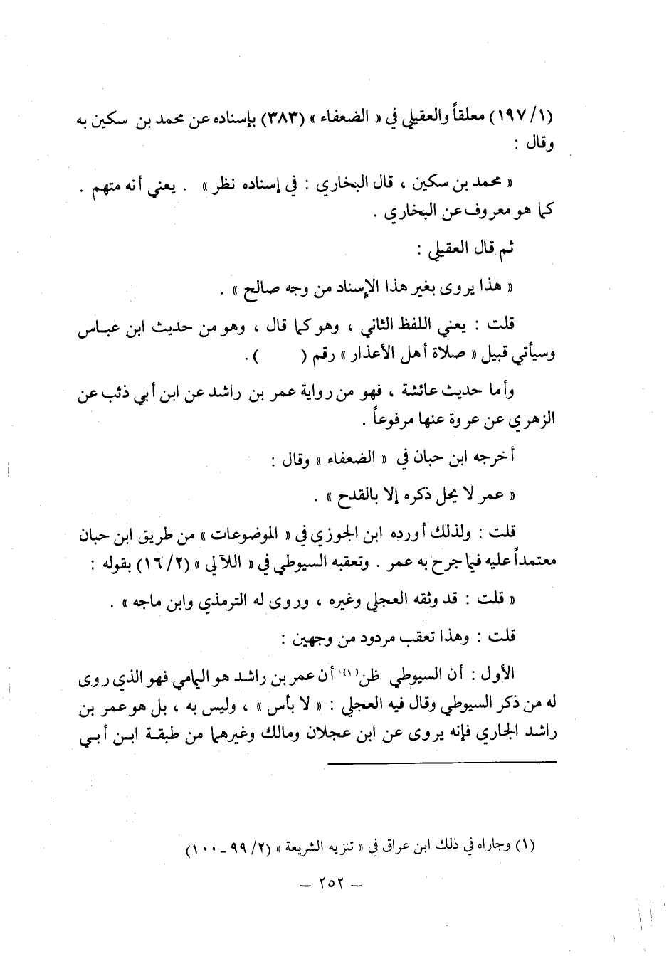قلت: ولذلك أورده ابن الجوزى فى " الموضوعات " من طريق ابن حبان معتمداً عليه فيما جرح به عمر. وتعقبه السيوطى فى " اللآلى " (2/16) بقوله: " قلت: قد وثقه العجلى وغيره , وروى له الترمذى وابن ماجه ".