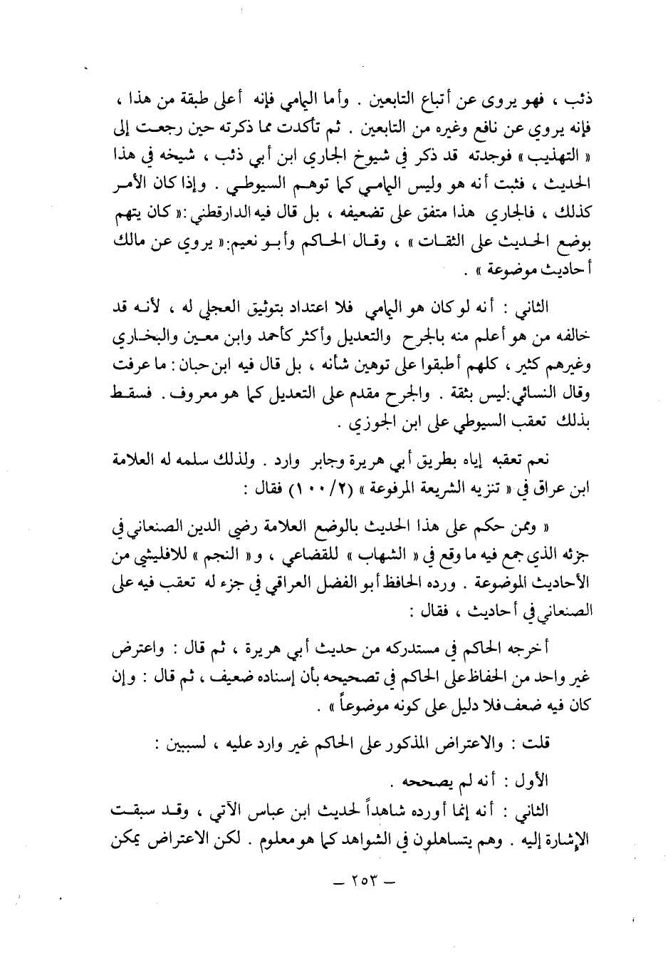 الثانى: أنه لو كان هو اليمامى فلا اعتداد بتوثيق العجلى له , لأنه قد خالفه من هو أعلم منه بالجرح والتعديل وأكثر كأحمد وابن معين والبخارى وغيرهم كثير , كلهم أطبقوا على توهين شأنه , بل قال فيه ابن حبان ما عرفت وقال النسائى: ليس بثقة. والجرح مقدم على التعديل كما هو معروف , فسقط بذلك تعقب السيوطى على ابن الجوزى.