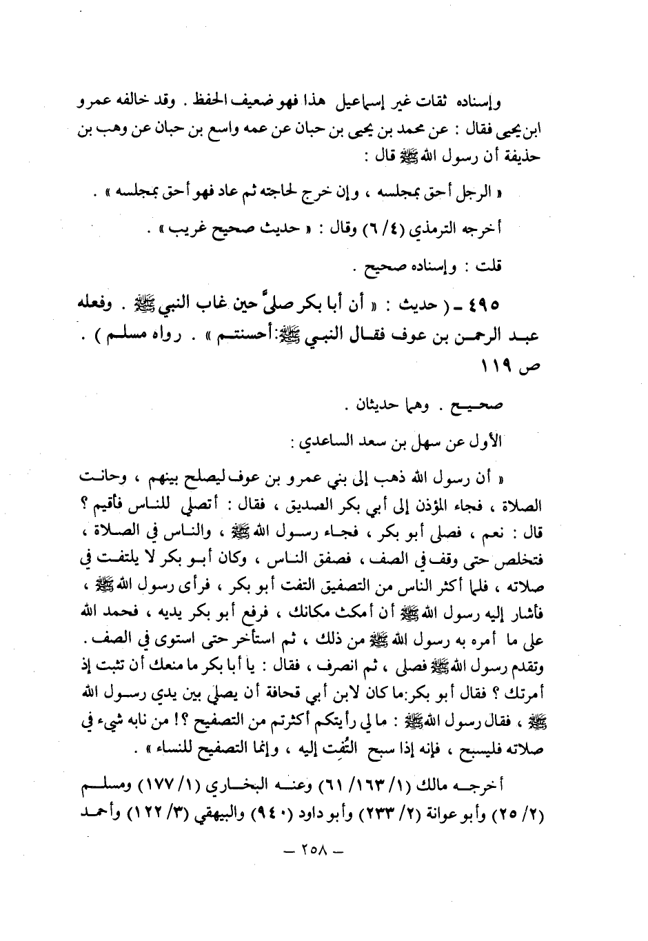 (495) - (حديث: " أن أبا بكر صلى حين غاب النبى صلى الله عليه وسلم , وفعله عبد الرحمن بن عوف فقال النبى صلى الله عليه وسلم أحسنتم " رواه مسلم (ص 119)