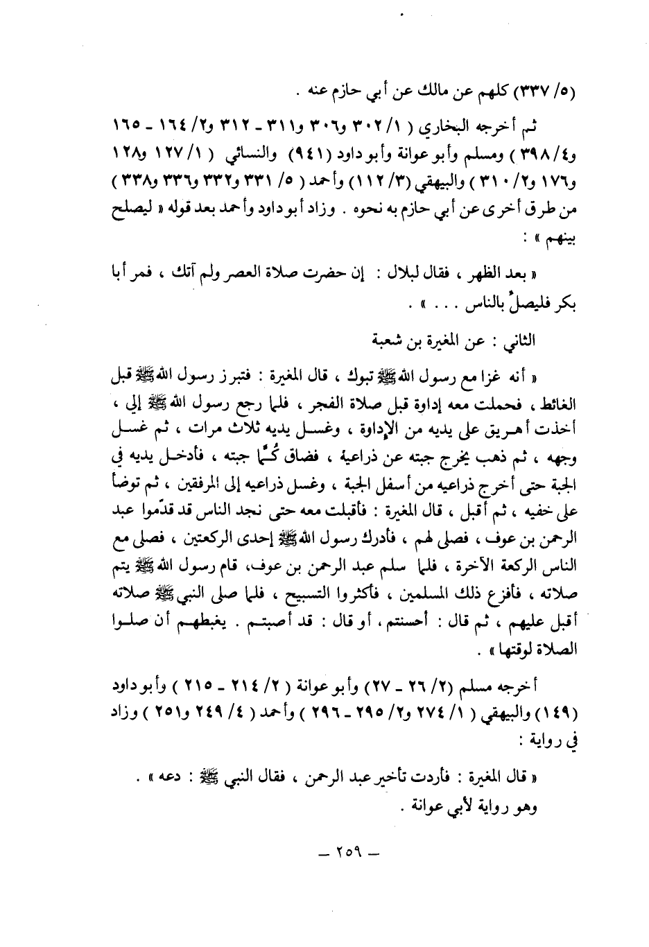 أخرجه مسلم (2/26 ـ 27) وأبو عوانة (2/214 ـ 215) وأبو داود (149) والبيهقى (1/274 و2/295 ـ 296) وأحمد (4/249 و251) وزاد فى رواية: " قال المغيرة: فأردت تأخير عبد الرحمن , فقال النبى صلى الله عليه وسلم: دعه " , وهو رواية لأبى عوانة.