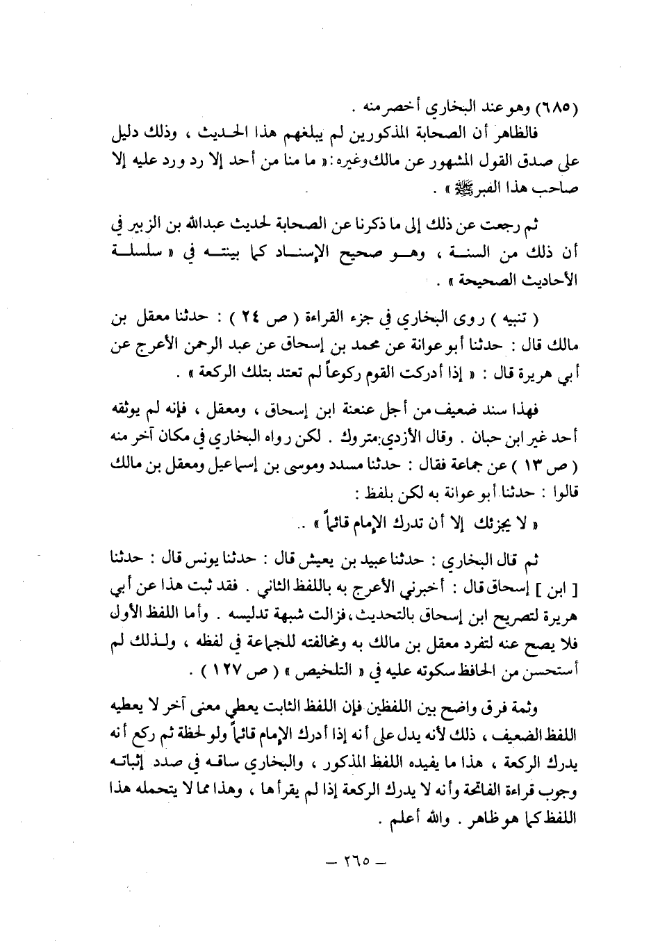 (تنبيه) : روى البخارى فى جزء القراءة (ص 24) : حدثنا معقل بن مالك قال: حدثنا أبو عوانة عن محمد بن إسحاق عن عبد الرحمن الأعرج عن أبى هريرة قال: " إذا أدركت القوم ركوعاً لم تعتد بتلك الركعة ".
