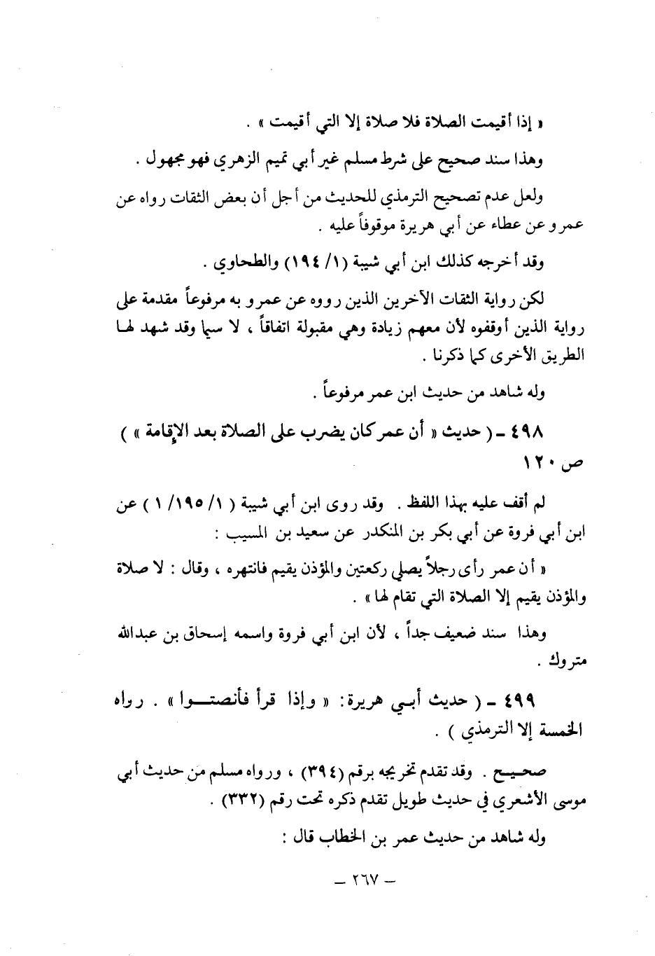 (498) - (حديث: " أن عمر كان يضرب على الصلاة بعد الإقامة " (ص 120) .