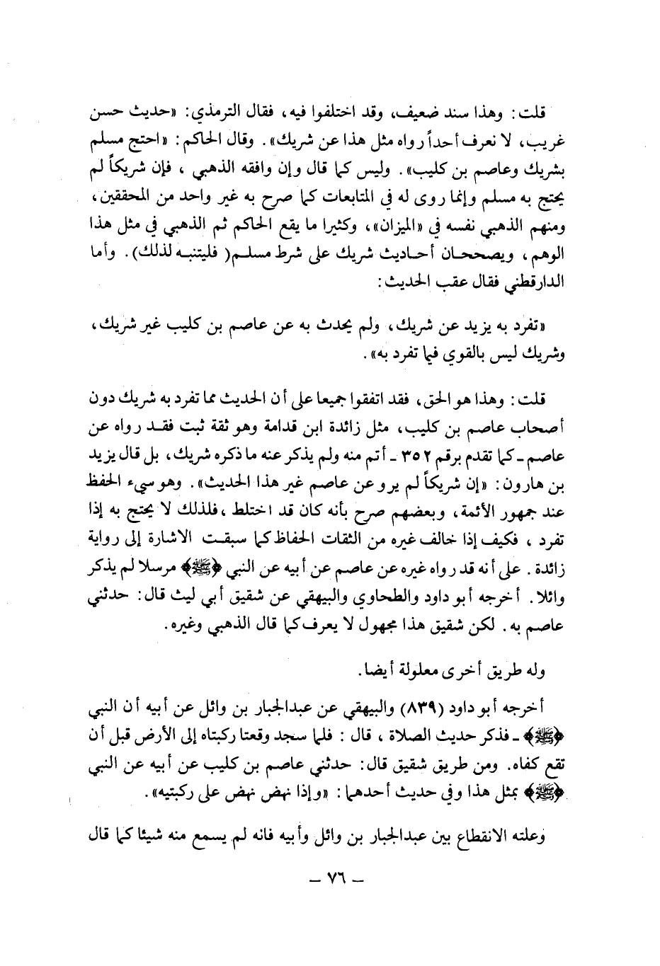 قلت: وهذا هو الحق , فقد اتفقوا جميعا على أن الحديث مما تفرد به شريك دون أصحاب عاصم بن كليب , مثل زائدة ابن قدامة وهو ثقة ثبت فقد رواه عن عاصم ـ كما تقدم برقم 352 ـ أتم منه ولم يذكر عنه ما ذكره شريك , بل قال يزيد بن هارون: " إن شريكا لم يرو عن عاصم غير هذا الحديث ". وهو سىء الحفظ عند جمهور الأئمة , وبعضهم صرح بأنه كان قد اختلط , فلذلك لا يحتج به إذا تفرد , فكيف إذا خالف غيره من الثقات الحفاظ كما سبقت الإشارة إلى رواية زائدة.