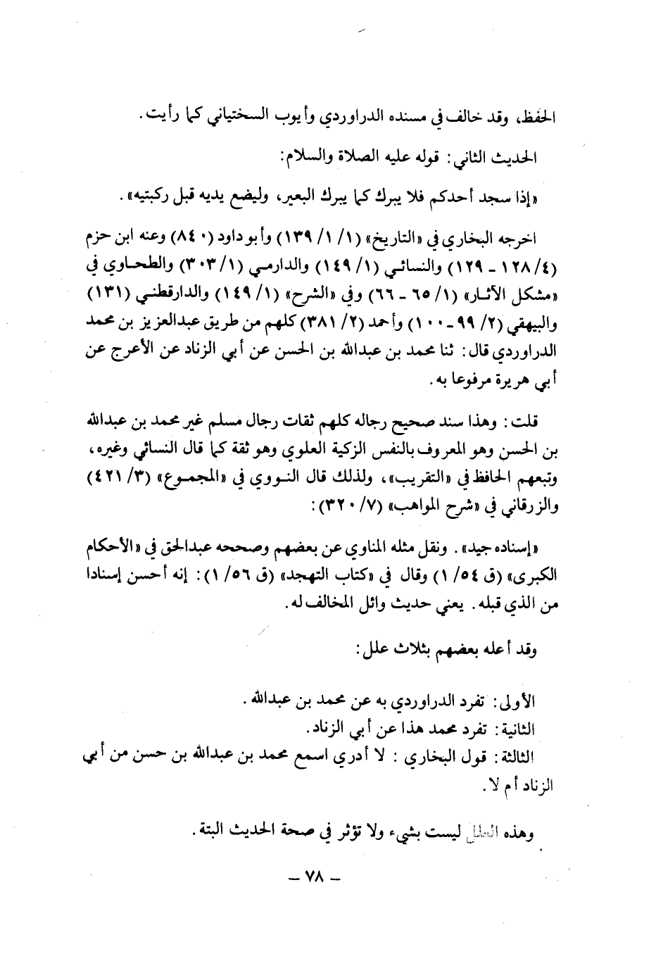 أخرجه البخارى فى " التاريخ " (1/1/139) وأبو داود (840) وعنه ابن حزم (4/128 ـ 129) والنسائى (1/149) والدارمى (1/303) والطحاوى فى " مشكل الآثار " (1/65 ـ 66) وفى " الشرح " (1/149) والدارقطنى (131) والبيهقى (2/99 ـ 100) وأحمد (2/381) كلهم عن طريق عبد العزيز بن محمد الدراوردى قال: حدثنا محمد بن عبد الله بن الحسن عن أبى الزناد عن الأعرج عن أبى هريرة مرفوعا به.