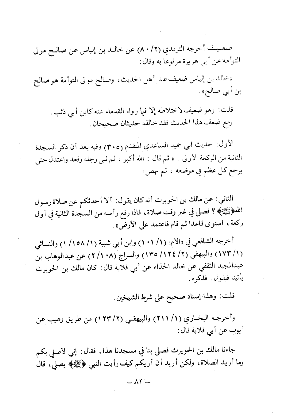 الثانى: عن مالك بن الحويرث أنه كان يقول: ألا أحدثكم عن صلاة رسول الله صلى الله عليه وسلم؟ فصلى فى غير وقت صلاة , فإذا رفع رأسه من السجدة الثانية فى أول ركعة , استوى قاعدا ثم قام فاعتمد على الأرض ".