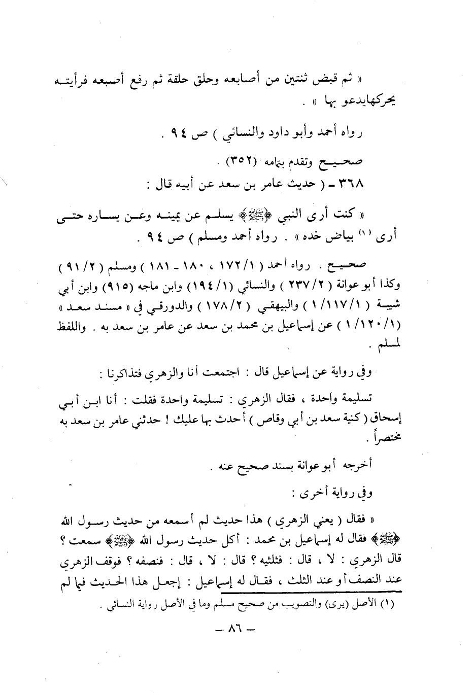 (368) - (حديث عامر بن سعد عن أبيه قال: " كنت أرى النبى صلى الله عليه وسلم يسلم عن يمينه وعن يساره حتى أرى (1) بياض خده ". رواه أحمد ومسلم (ص 94) .