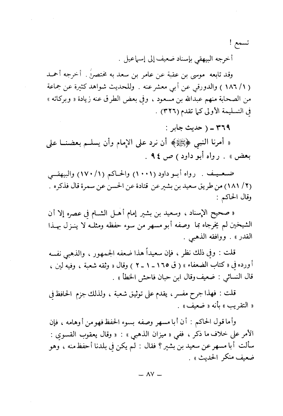 قلت: وفى ذلك نظر , فإن سعيدا هذا ضعفه الجمهور , والذهبى نفسه أورده فى " كتاب الضعفاء " (ق 165 ـ 1 ـ 2) وقال " وثقه شعبة , وفيه لين , قال النسائى: ضعيف وقال ابن حبان فاحش الخطأ ".