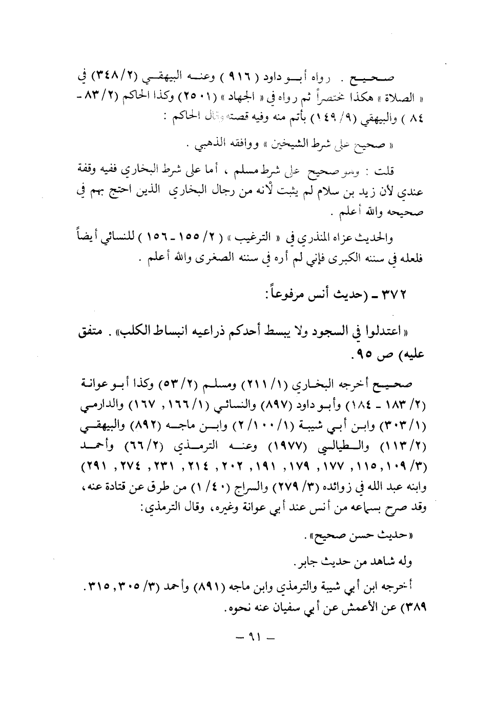 (372) - (حديث أنس مرفوعا: " اعتدلوا فى السجود ولا يبسط أحدكم ذراعيه انبساط الكلب ". متفق عليه (ص 95) .