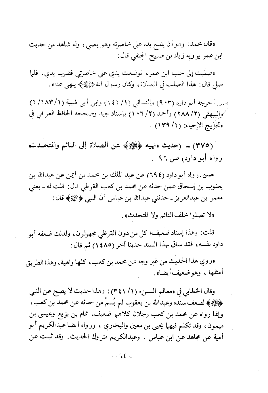 (375) - (حديث: " نهيه صلى الله عليه وسلم عن الصلاة إلى النائم والمتحدث " رواه أبو داود (ص 96) .