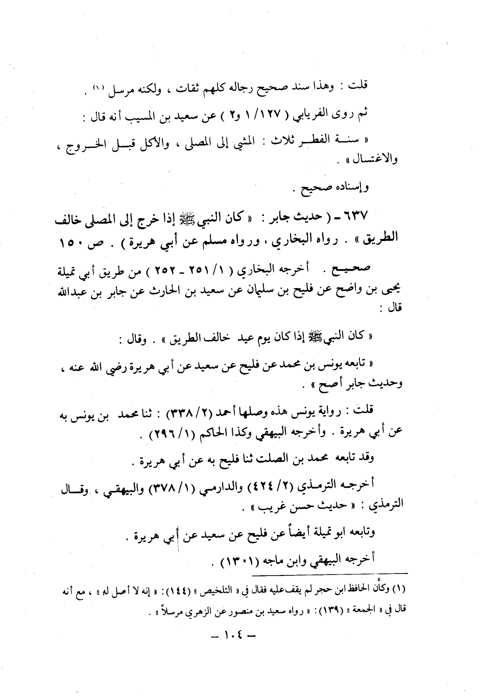 (637) - (حديث جابر: " كان النبى صلى الله عليه وسلم إذا خرج إلى المصلى خالف الطريق " رواه البخارى , ورواه مسلم عن أبى هريرة (ص 150) .