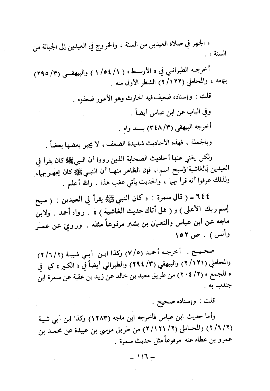 ولكن يغنى عنها أحاديث الصحابة الذين رووا أن النبى صلى الله عليه وسلم كان يقرأ فى العيدين " بالغاشية " وسبح اسم " , فإن الظاهر منها أن النبى صلى الله عليه وسلم كان يجهر بهما , ولذلك عرفوا أنه قرأ بهما , والحديث يأتى عقب هذا والله أعلم.
