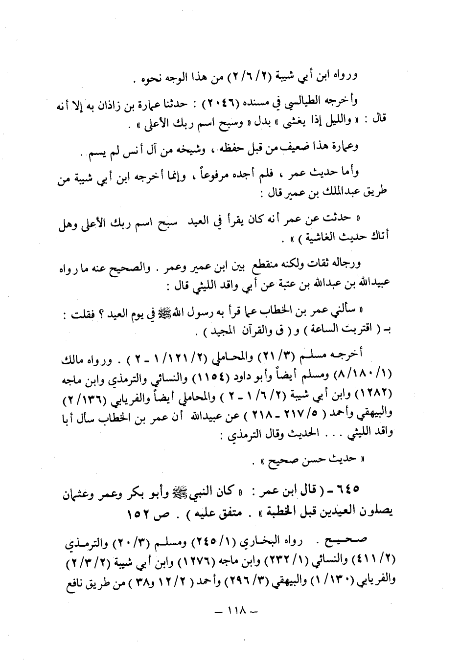 (645) - (قال ابن عمر: " كان النبى صلى الله عليه وسلم وأبو بكر وعمر وعثمان يصلون العيدين قبل الخطبة " متفق عليه (ص 152) .