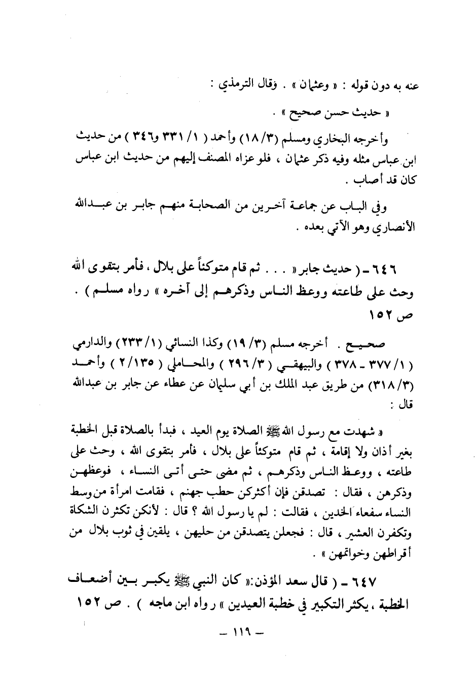 (647) - (قال سعد المؤذن: " كان النبى صلى الله عليه وسلم يكبر بين أضعاف الخطبة , يكثر التكبير فى خطبة العيدين " رواه ابن ماجه (ص 152) .