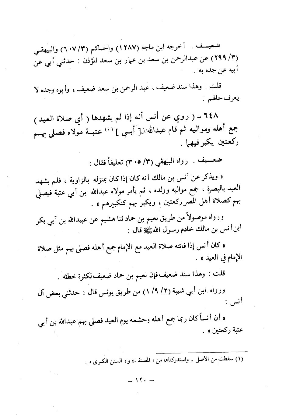 (648) - (روى عن أنس " أنه إذا لم يشهدها (أى صلاة العيد) جمع أهله ومواليه ثم قام عبد الله بن [أبى] (1) عتبة مولاه فصلى بهم ركعتين يكبر فيهما ".