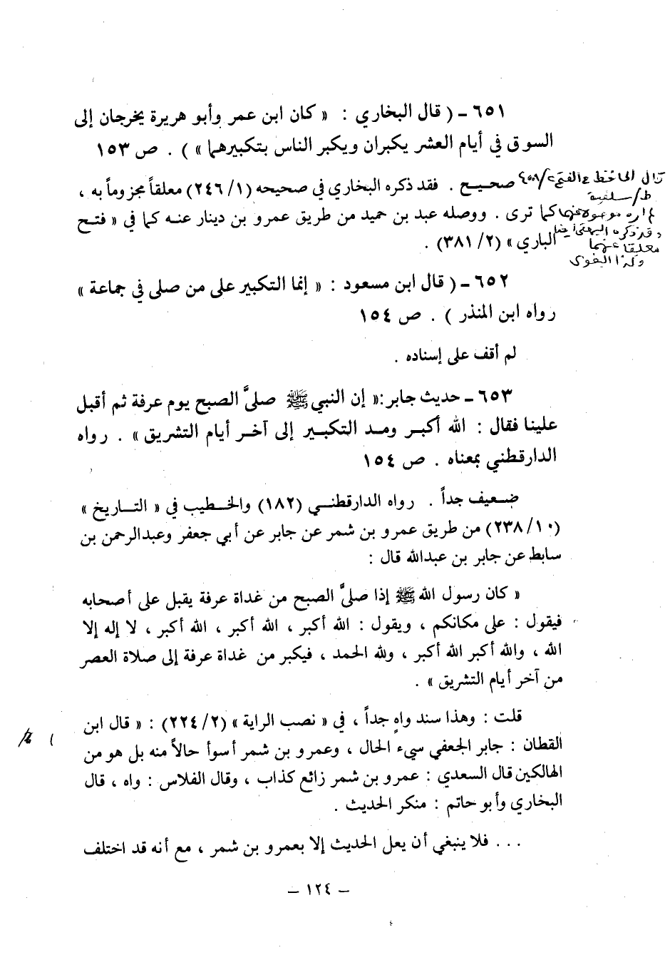 (653) - (حديث جابر: " إن النبى صلى الله عليه وسلم صلى الصبح يوم عرفة ثم أقبل علينا فقال: الله أكبر ومد التكبير إلى آخر أيام التشريق ". رواه الدارقطنى بمعناه (ص 154) .