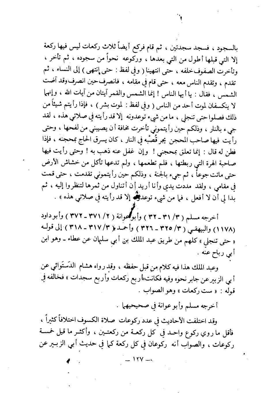 وقد اختلفت الأحاديث فى عدد ركوعات صلاة الكسوف اختلافا كثيرا , فأقل ما روى ركوع واحد فى كل ركعة من ركعتين , وأكثر ما قيل خمسة ركوعات , والصواب أنه ركوعان فى كل ركعة كما فى حديث أبى الزبير عن