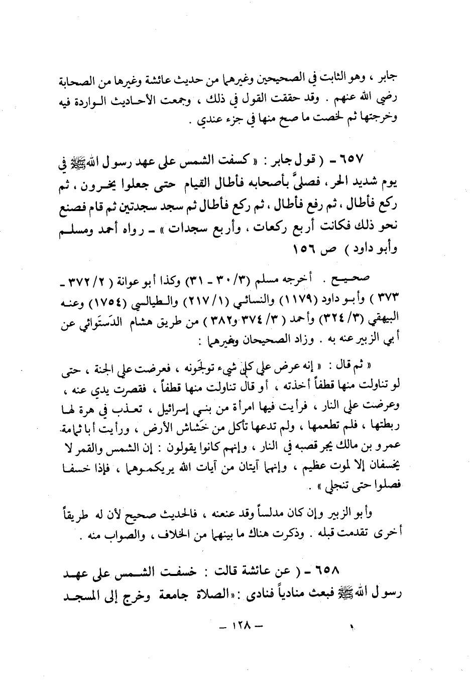 (657) - (قول جابر: " كسفت الشمس على عهد رسول الله صلى الله عليه وسلم فى يوم شديد الحر , فصلى بأصحابه فأطال القيام حتى جعلوا يخرون , ثم ركع فأطال , ثم رفع فأطال , ثم ركع فأطال ثم سجد سجدتين ثم قام فصنع نحو ذلك فكانت أربع ركعات , وأربع سجدات ". رواه أحمد ومسلم وأبو داود (ص 156) .