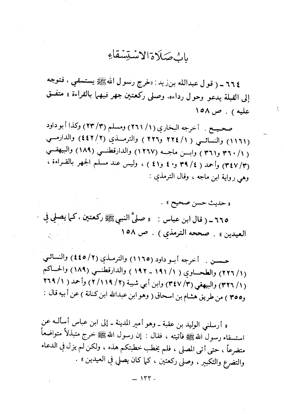(664) - (قول عبد الله بن زيد: " خرج رسول الله صلى الله عليه وسلم يستسقى , فتوجه إلى القبلة يدعو وحول رداءه , وصلى ركعتين جهر فيهما بالقراءة " متفق عليه (ص 158) .
