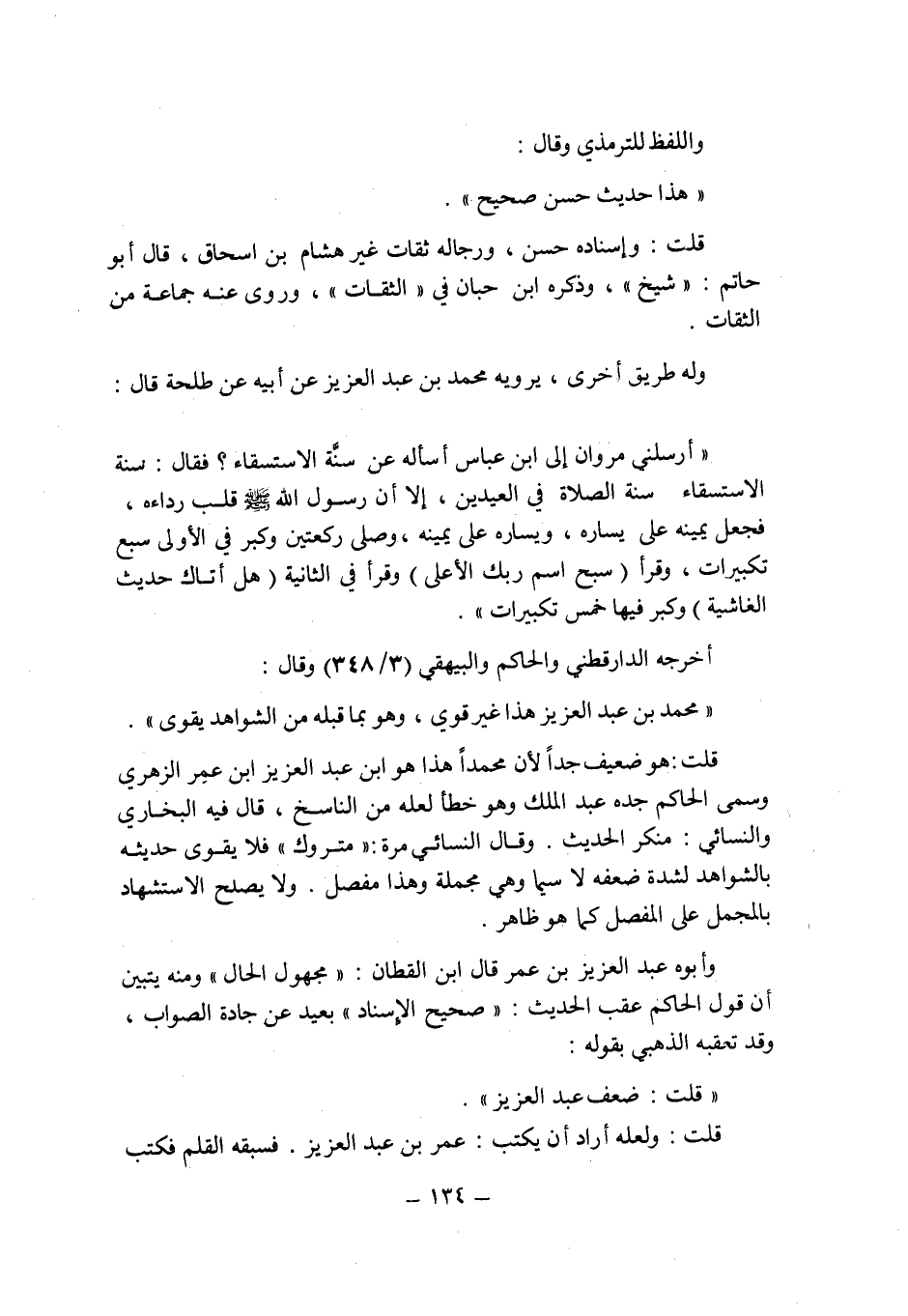 وله طريق أخرى , يرويه محمد بن عبد العزيز عن أبيه عن طلحة قال: " أرسلنى مروان إلى ابن عباس أسأله عن سنة الاستسقاء؟ فقال: سنة الاستسقاء سنة الصلاة فى العيدين , إلا أن رسول الله صلى الله عليه وسلم قلب رداءه , فجعل يمينه على يساره , ويساره على يمينه , وصلى ركعتين وكبر فى الأولى سبع تكبيرات , وقرأ (سبح اسم ربك الأعلى) وقرأ فى الثانية (هل أتاك حديث الغاشية) وكبر فيها خمس تكبيرات ".