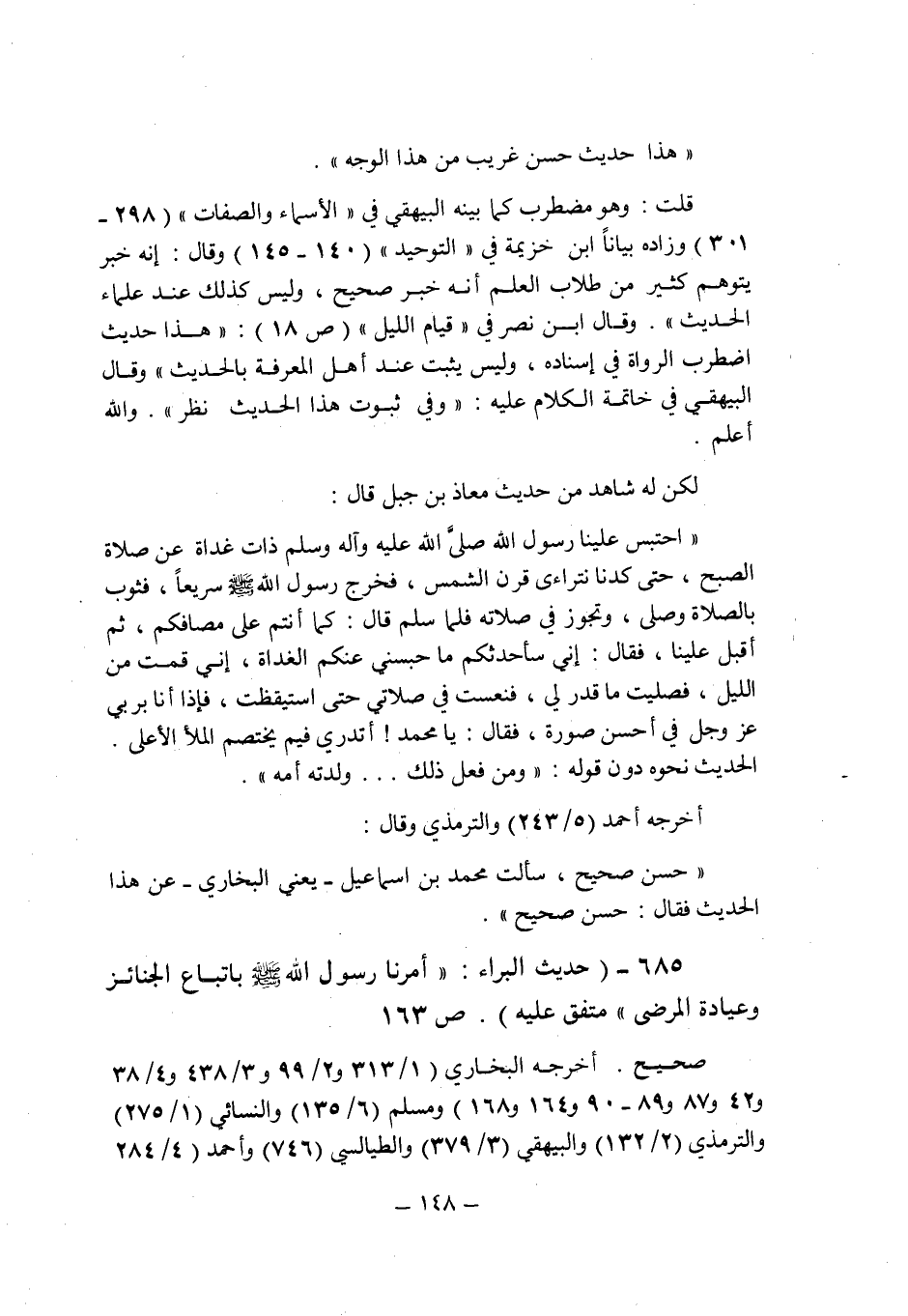 قلت: وهو مضطرب كما بينه البيهقى فى " الأسماء والصفات " (298 ـ 301) وزاده بيانا ابن خزيمة فى " التوحيد " (140 ـ 145) وقال: إنه خبر يتوهم كثير من طلاب العلم أنه خبر صحيح , وليس كذلك عند علماء الحديث ".