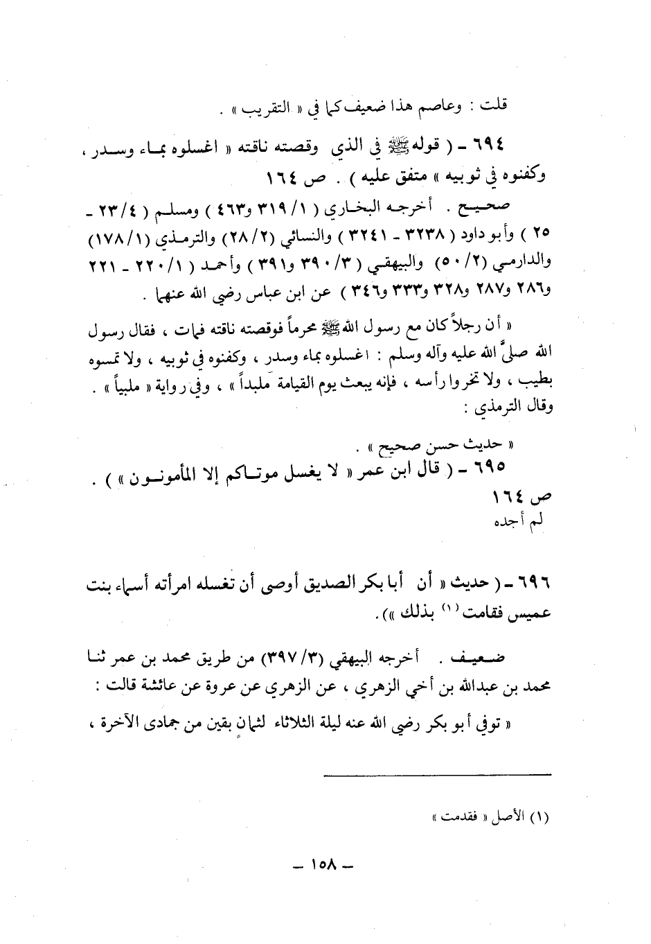 (694) - (قوله صلى الله عليه وسلم فى الذى وقصته ناقته: " اغسلوه بماء وسدر , وكفنوه فى ثوبيه " متفق عليه (ص 164) .