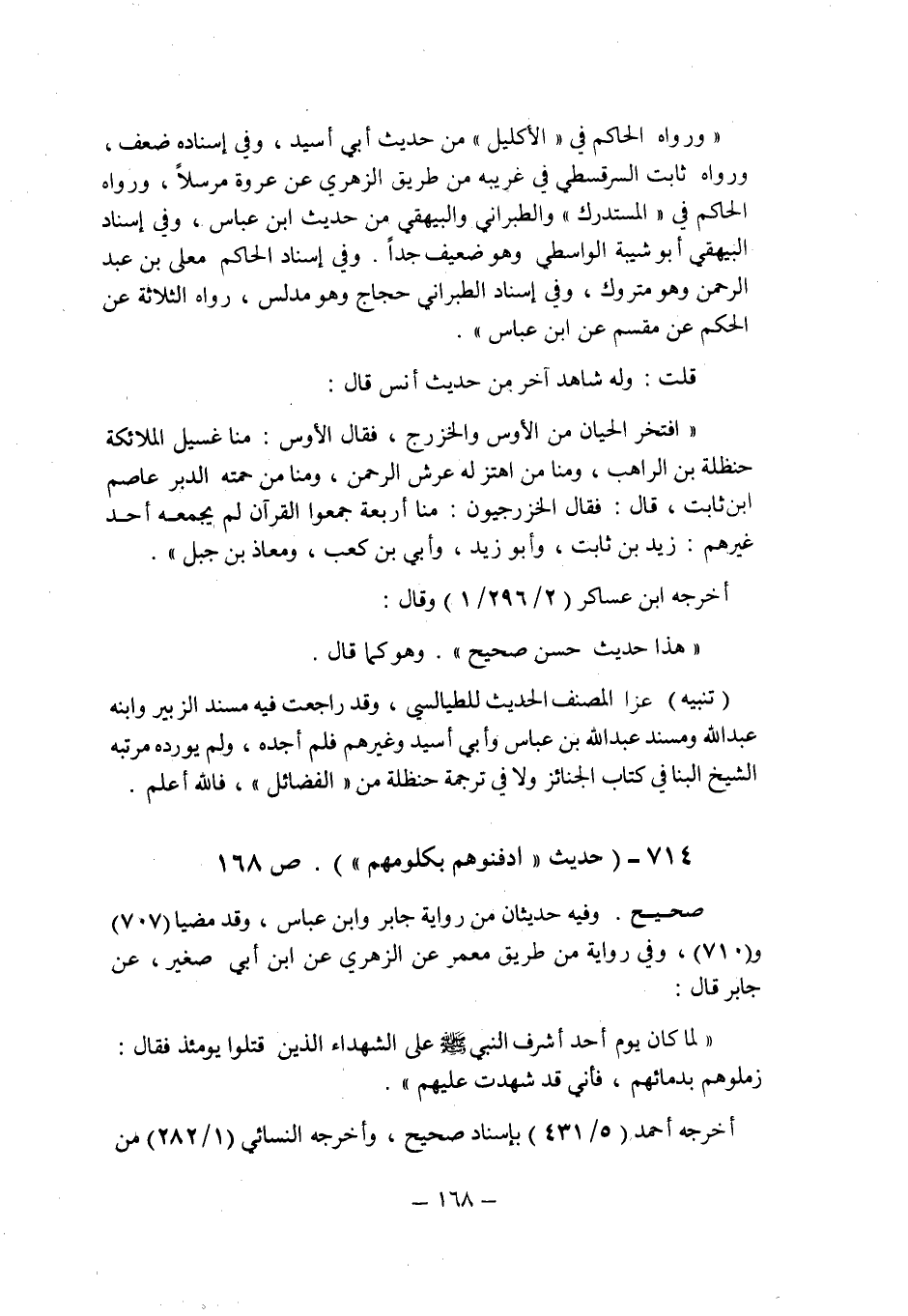 (714) - (حديث: " ادفنوهم بكلومهم " (ص 168) .